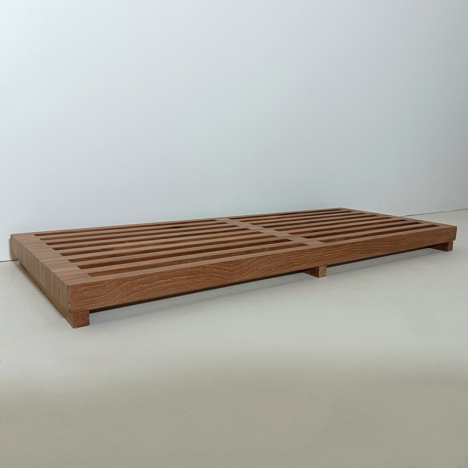 דק מעץ טיק לרצפת המקלחת/ אמבטיה – כולל קורות תחתונות להגבהת המשטח מהרצפה וזרימה קלה של המים. מתאים לתוך המקלחון ומחוץ לו, ניתן לקבע לרצפה בתור דק/ רצפת עץ או להשאיר נייד בתור משטח עמידה/ מדרך.