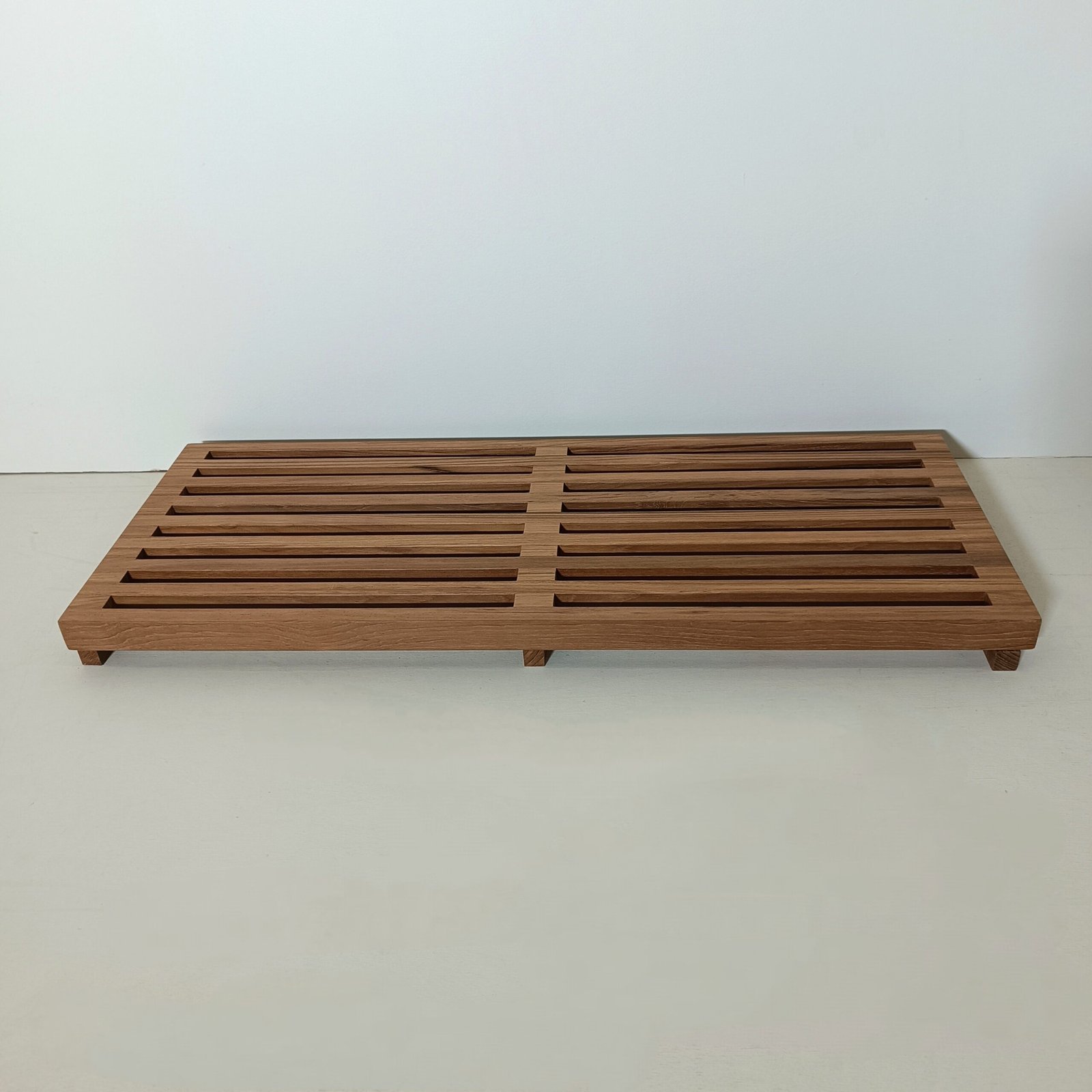 פתרון נהדר כדי לא לעמוד על הרצפה הקרה והחלקה, המשפר את הבטיחות במקלחת. ניתן לשלב עם ספסל תואם למקלחת ופתרונות נוספים שלי למקלחת מעץ טיק.