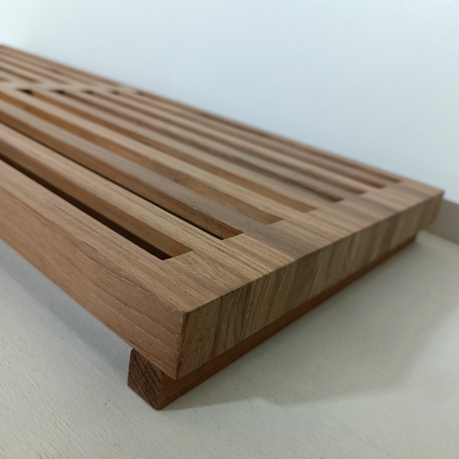 משטח עמידה למקלחת מעץ טיק – בהזמנה במידות שתרצו. עמידה על פלטת עץ חמימה ונעימה במקום על קרמיקה קרה, רטובה וחלקלקה.
